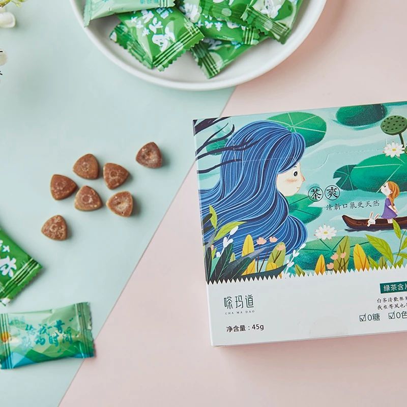由茶爽科技与浙江大学合作的产品,嗏玛道拥有学术级背书。清口吃茶同样也是茶糖形式,但被定义成“含片”,旨在明确食用方式,心急嚼碎可能感受不到产品宣传的那般奇妙。