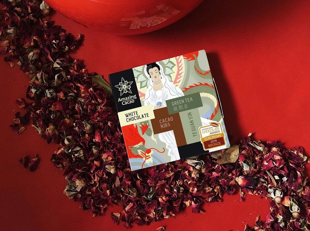 作为第一个获得国际巧克力大奖的俄罗斯品牌,Amazing Cacao在风味巧克力系列中推出三款含有茶元素的特别款,分别为40%秘鲁白巧克力&茶享馨红茶、秘鲁白巧克力&福建铁观音和印度苦巧克力&玛莎拉茶,额外添加甘蔗糖以中和风味。