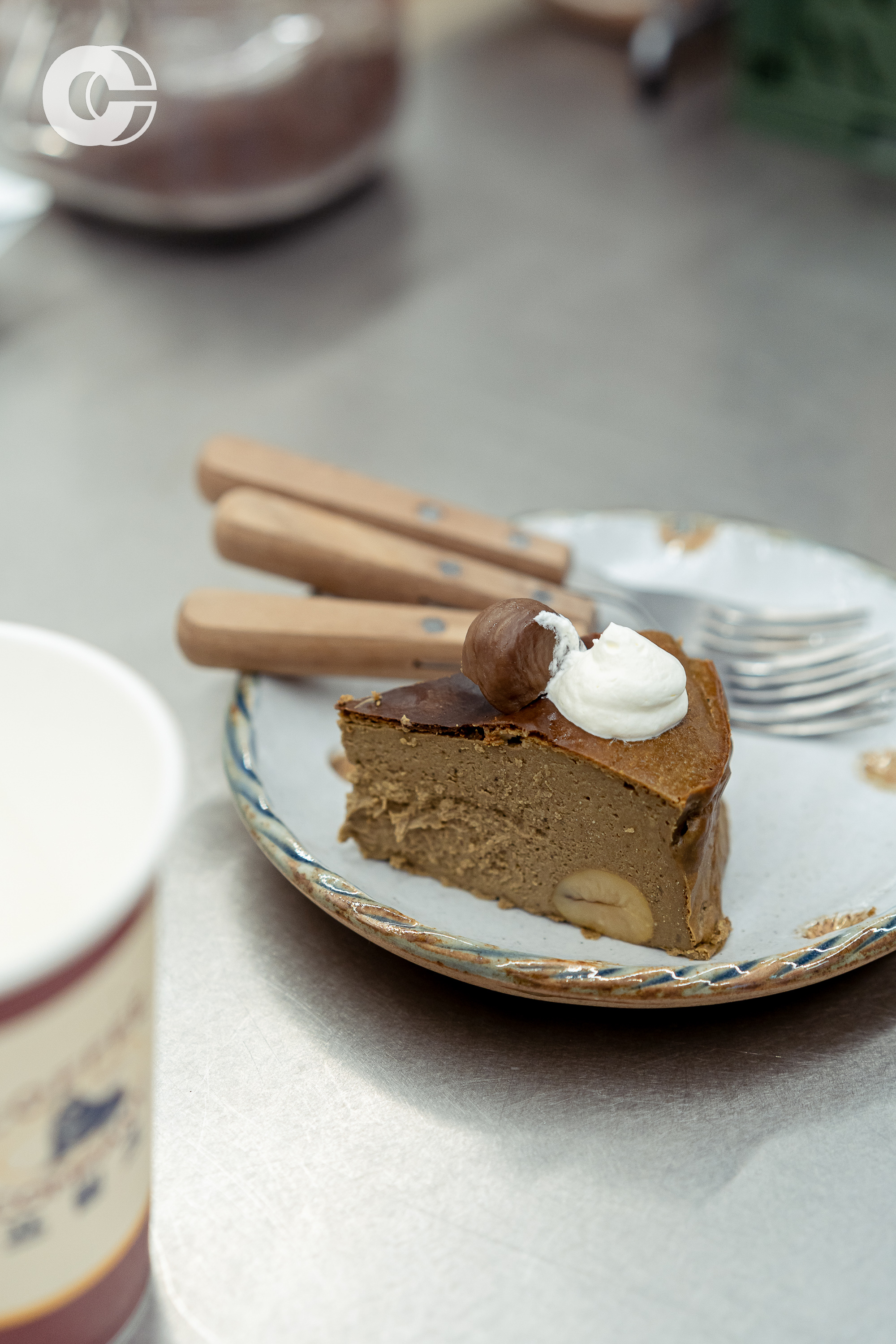 藏着整颗栗子果仁的焙茶栗子巴斯克小巧可爱。与常见的抹茶、红茶类的巴斯克蛋糕不同,焙茶少了一丝苦涩,多了一份焙炭气息,入口是十分温厚的,就像在吃一块浓郁丝滑的奶茶。