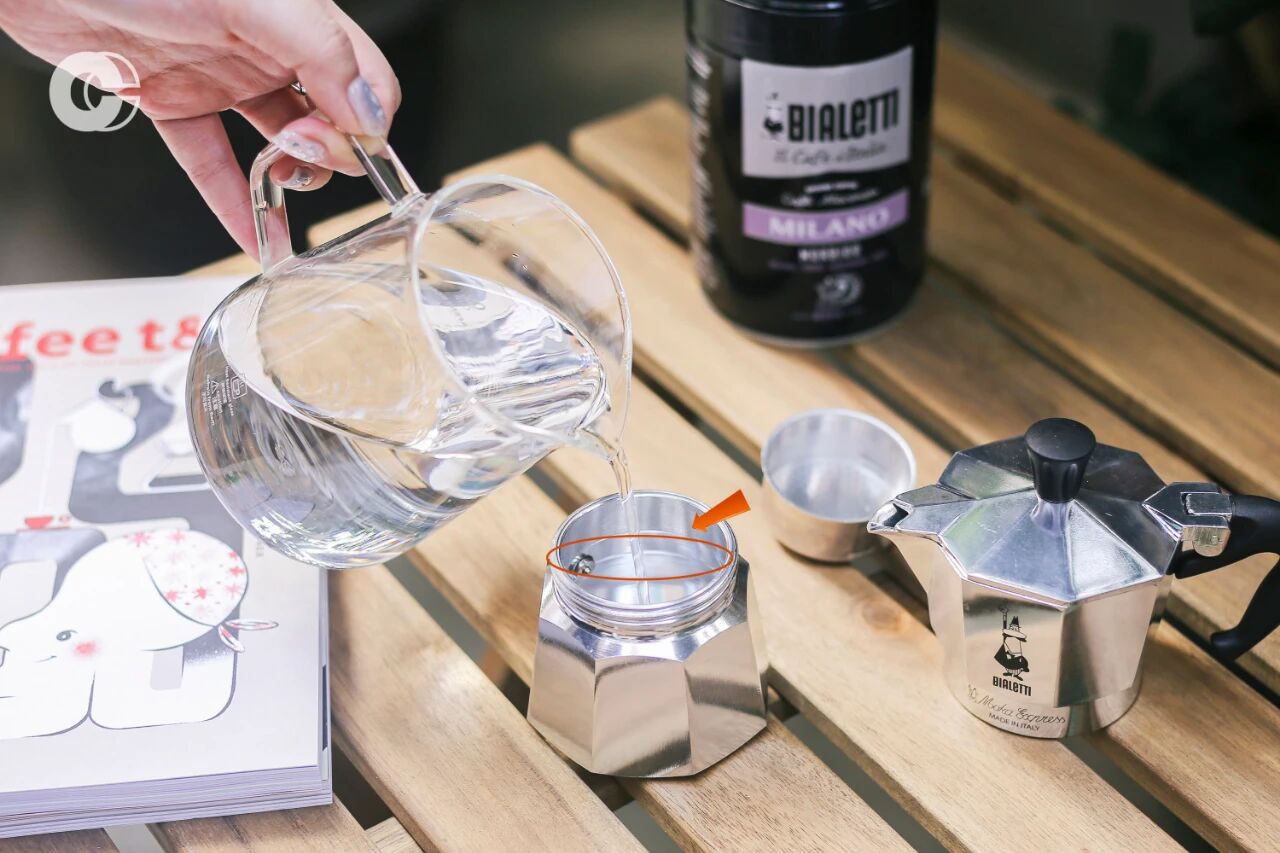 ①在壶的下座倒入开水,水位不要超过安全阀高度。(Bialetti比乐蒂这款壶底壶里有一道线,以这道线为基准就好;)