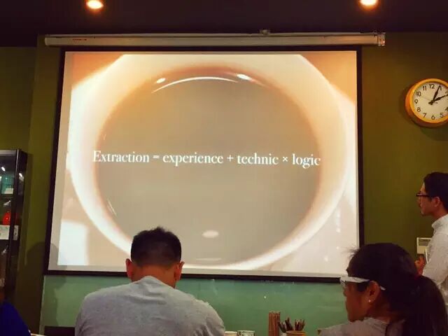 Hidenori的分享更像是一堂哲学课。他带来的是关于“为什么”的重要性,很有新意地将经验用“数学方程”式的表达出来。他建议咖啡师尽量将咖啡师记录下制作时的一些数据,时间、粉量、液体、口感等,并制作成表格相互对比,从中找到逻辑性。