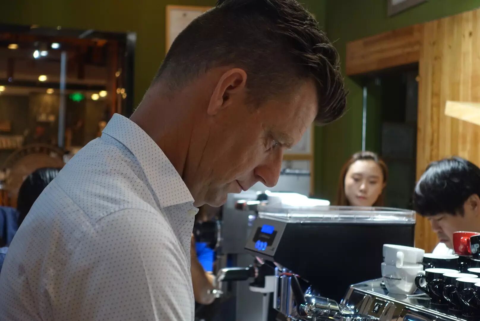 不用怀疑,这就是激烈的大师对决~丸山老师选择了大家都觉得不怎么喜欢的印尼Wahana豆子作为挑战目标,要求两位大师在最短时间内调适出最好喝的Espresso。