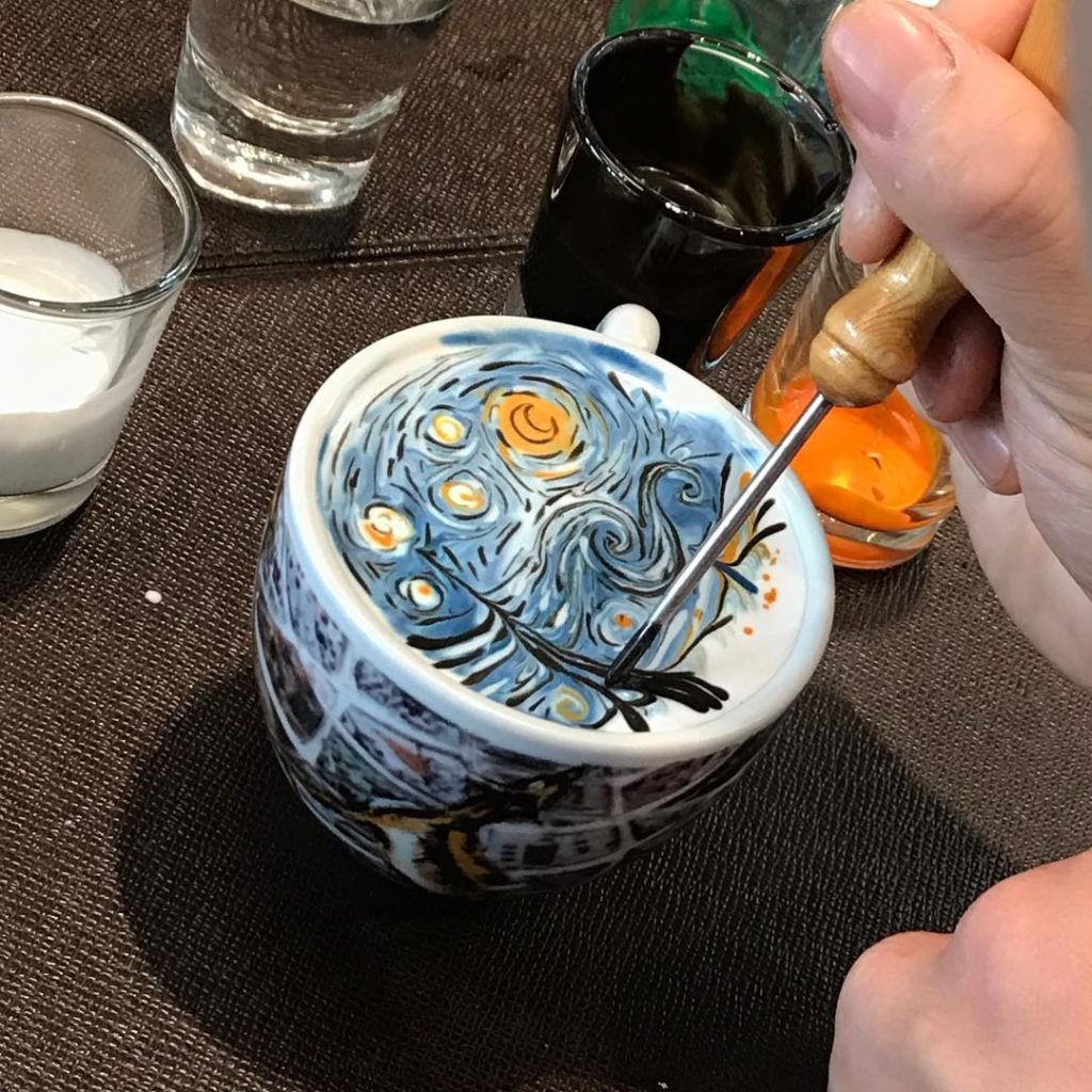 If you think a phoenix latte art is something quite special, then Kangbin’s cup of coffee with Van Gogh’s Starry Night on top will for sure blow your mind away. Articles featured Kangbin and his cream art went wild online. All in a suddenly this South Korean barista was seen on media sources from coffee to art, which were published in many regions including almost the whole Europe, the US, Australia, and Asia. Furthermore, Kangbin is also described as having the face and body of a model. The two factors combined to result in a long queue outside his own cafe, Cafe C.THROUGH in Seoul, waiting for a cold cup of coffee costing 10,000 won ($8.71) and taking 15 minutes to produce.