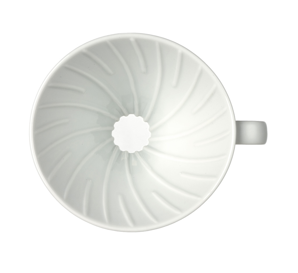 In the past decade, five World Brewers Cup Championships (WBrC)[3] were won by baristas competing with V60, a coffee dripper developed by renowned Japanese company HARIO in 2004. Known for delivering a bright clean cup, the dripper was named after the V-shape and the angle of 60 degrees. The innovative spiral ribs allow coffee grounds to expand and the layer of air created between the paper filter and the dripper to release. The large single hole in the bottom of the cone gives paper filter the space to mimic the extraction of a cloth filter. All these design details make the V60 a favorite coffee brewer by both professional baristas and home users.