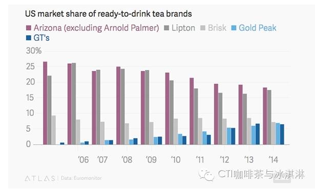 美国不同茶饮品牌所占市场份额,数据更新到2014年。由图可见,Arizona与联合利华旗下的Lipton立顿两者间的竞争相对抗衡,但总体所占份额都在走下坡,Brisk、Gold Peak、GT’s这些品牌与前两者的距离正在不断拉近。换而言之,Arizona的低价策略并不是一个长久之道,市场永远处在复杂难测的变化之中。