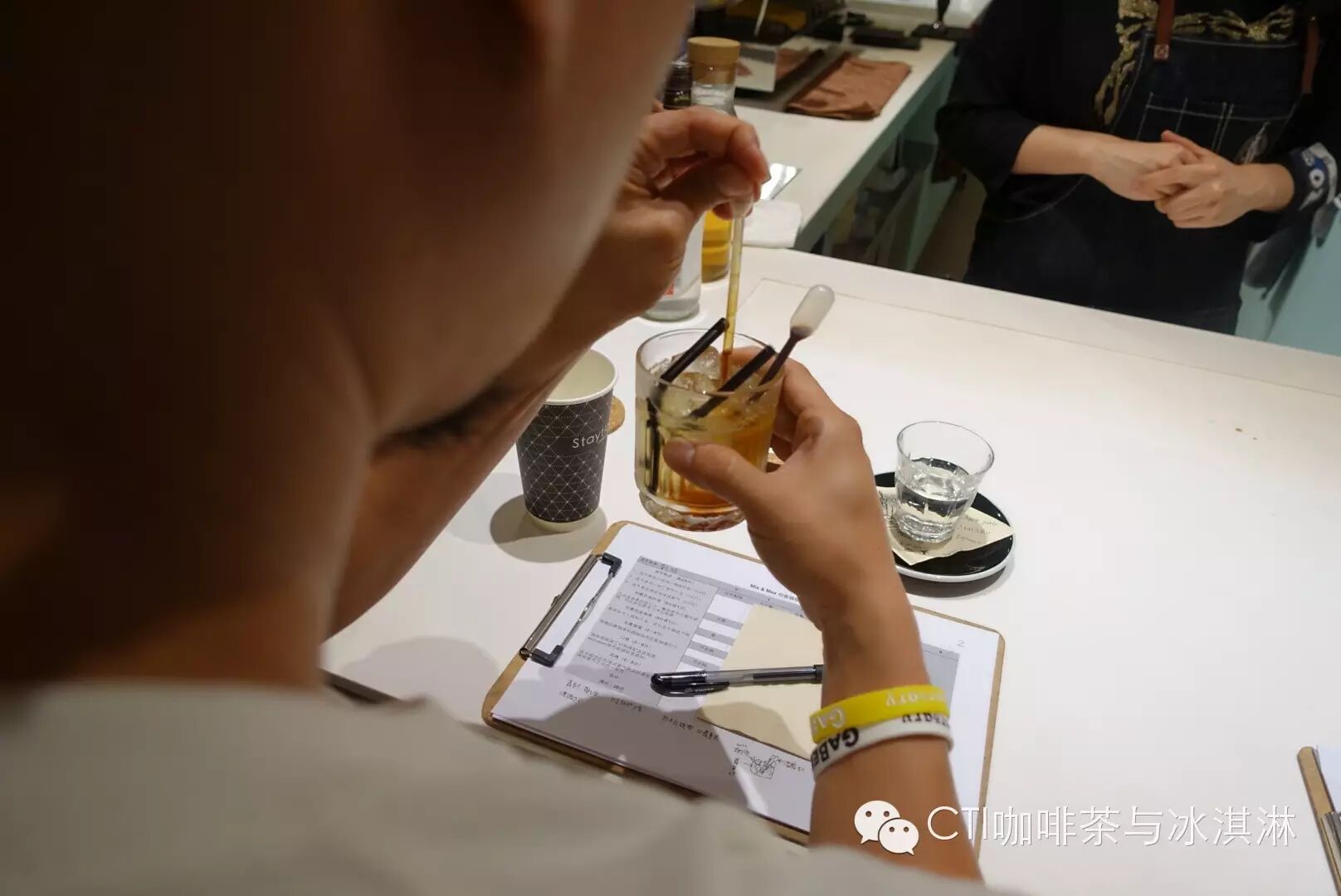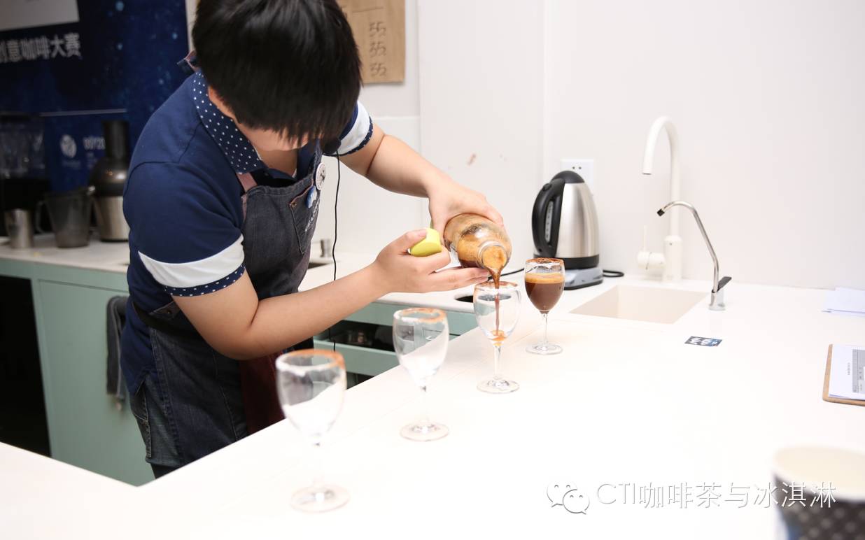 来自Griffin Coffee的戴维把苹果汁加入了创意咖啡中,评委把手中的滴管中咖啡滴入杯中,有没有格外诱人呢