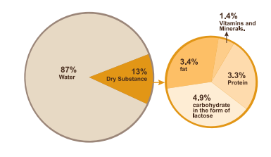 Quantities of the main constituents of raw milk from cows vary considerably; between cows of different breeds and between individual cows of the same breed. Cow’s milk consists of about 87% water and 13% dry substance. The dry substance consists of approximately 4.9% carbohydrate in the form of lac?tose, 3.4% fat, 3.3% protein, and vitamins and minerals.